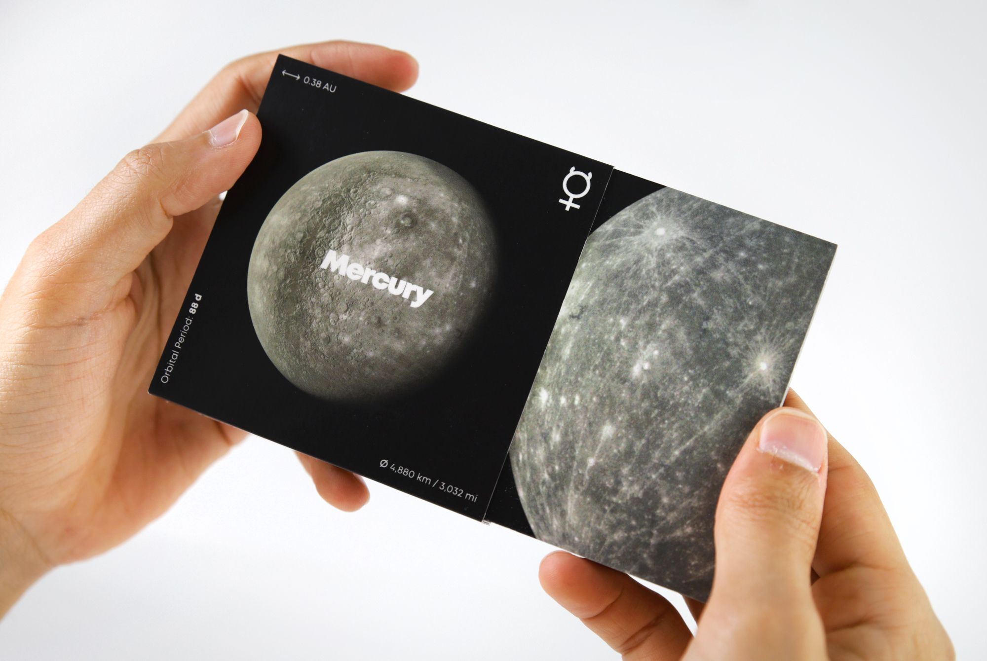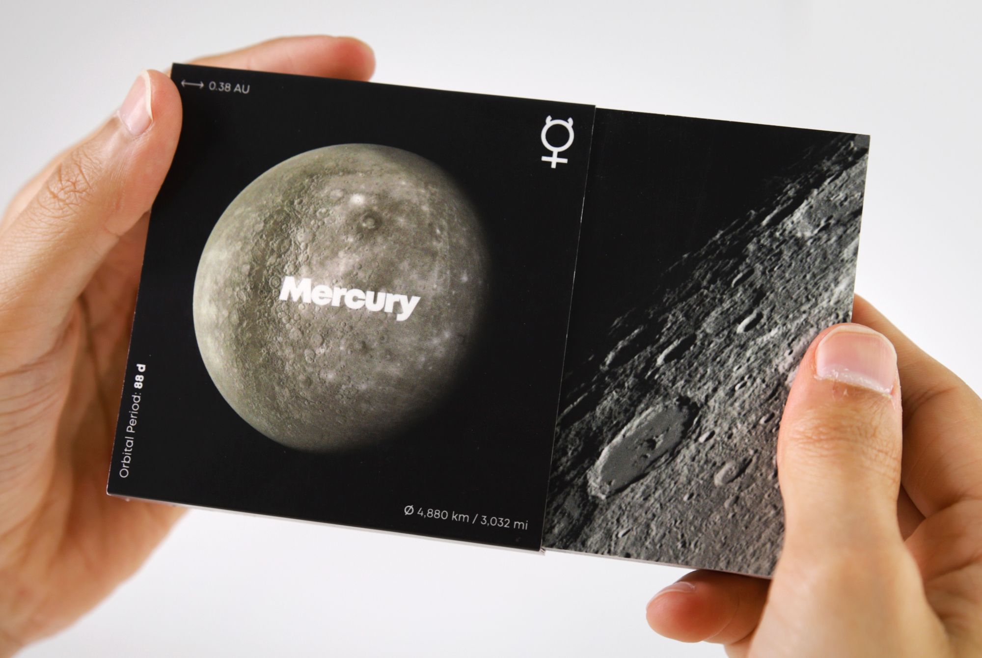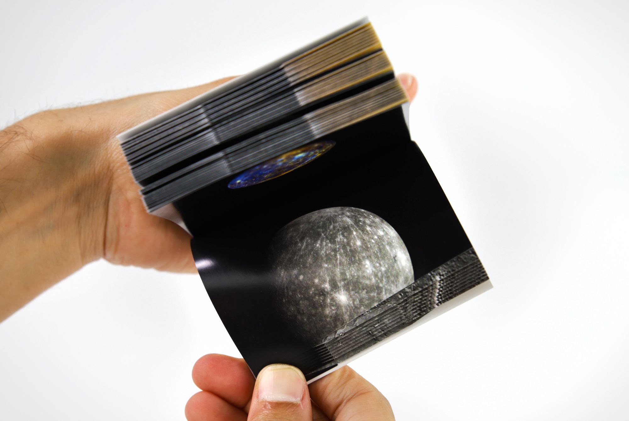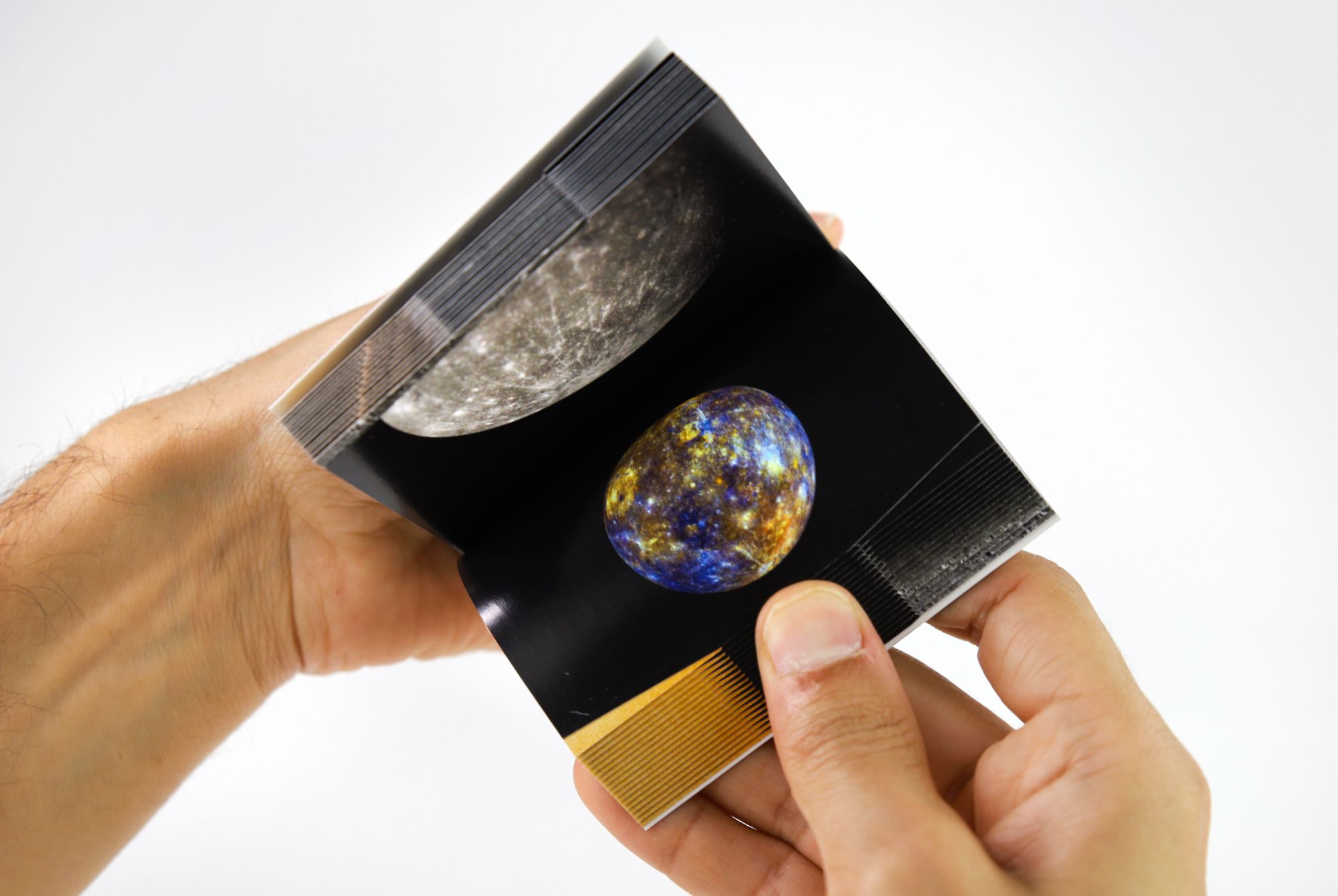 Fedezd fel a Merkúr titkait hat lenyűgöző animációs sorozaton keresztül! A Flipboku technológiájának köszönhetően a könyv lapjait a hüvelykujjad különböző pozícióiban (fent, lent, oldalt) pörgetve hat különböző mozgóképet hívhatsz elő. Mint a Naphoz legközelebb eső bolygó, a Merkúr a sebesség és a végletek világa – kietlen, kráterekkel borított felszíne most a kezedben elevenedik meg.
