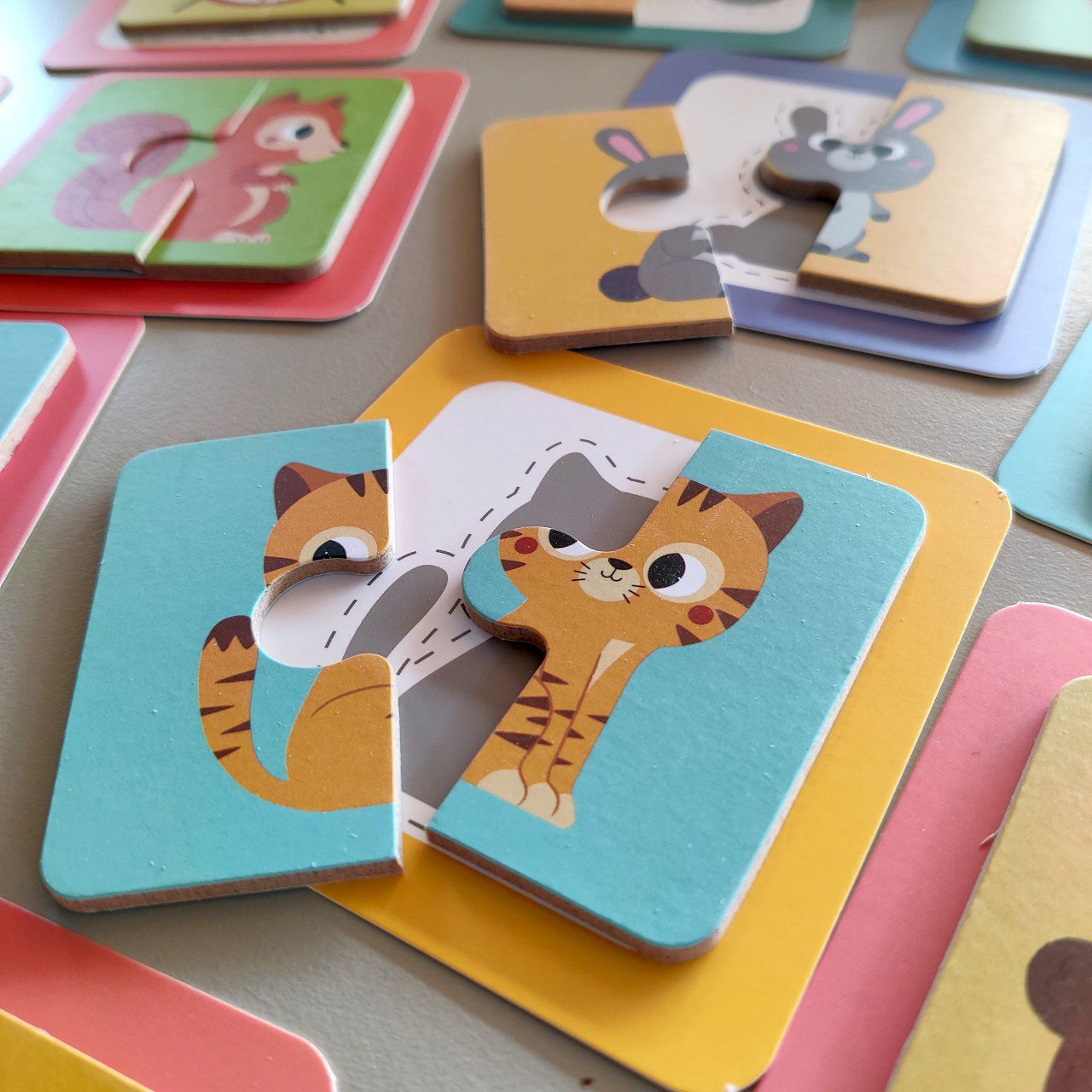 A játék tartalma: 32 db egyszerű forma, főként állatok, gyümölcsök, használati eszközök